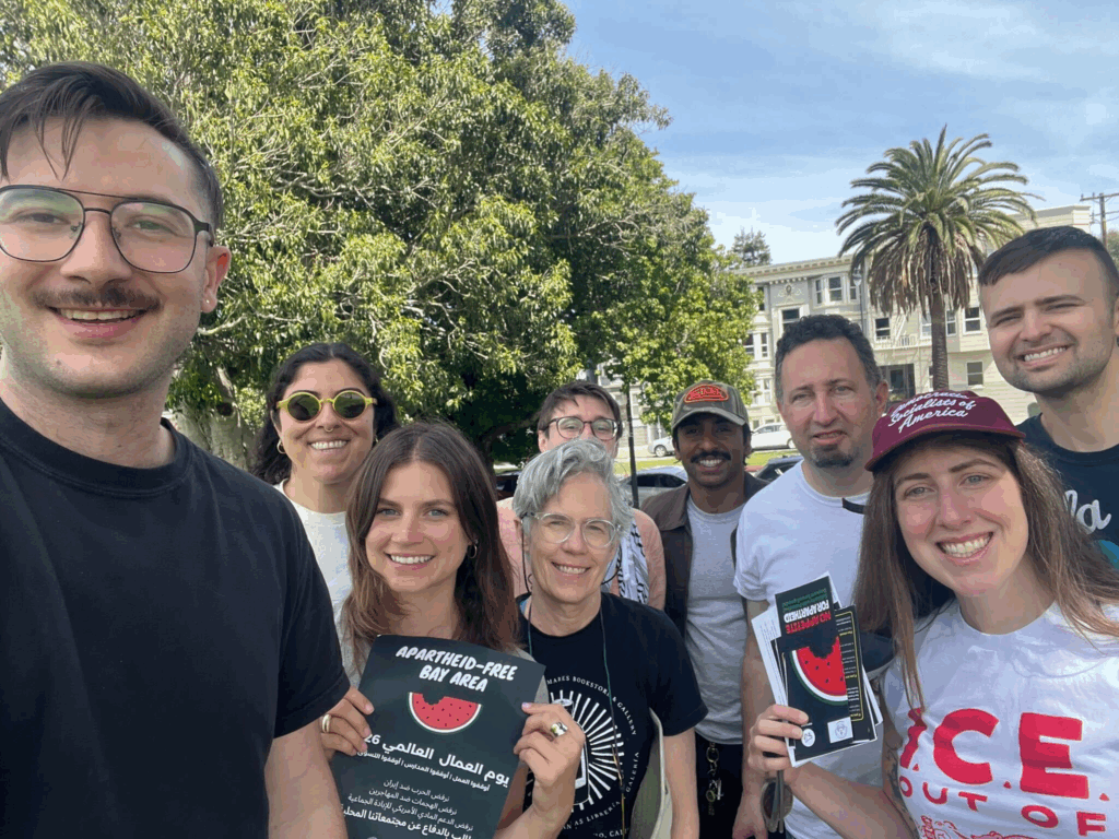 Members of our Immigrant Justice and Palestine Solidarity and Anti-Imperialism working groups came together with our coalition partners in AROC to canvass 30 stores in the Mission in preparation for May Day. NA4A has already engaged these stores as part of our campaign to de-shelve products from companies complicit in Israeli apartheid and genocide, and this canvass further cultivated our relationship with them by giving them avenues to engage with the rest of the community to stand up against domestic repression under ICE and the illegal imperialist devastation that the United States and Israel are visiting on people in West Asia.