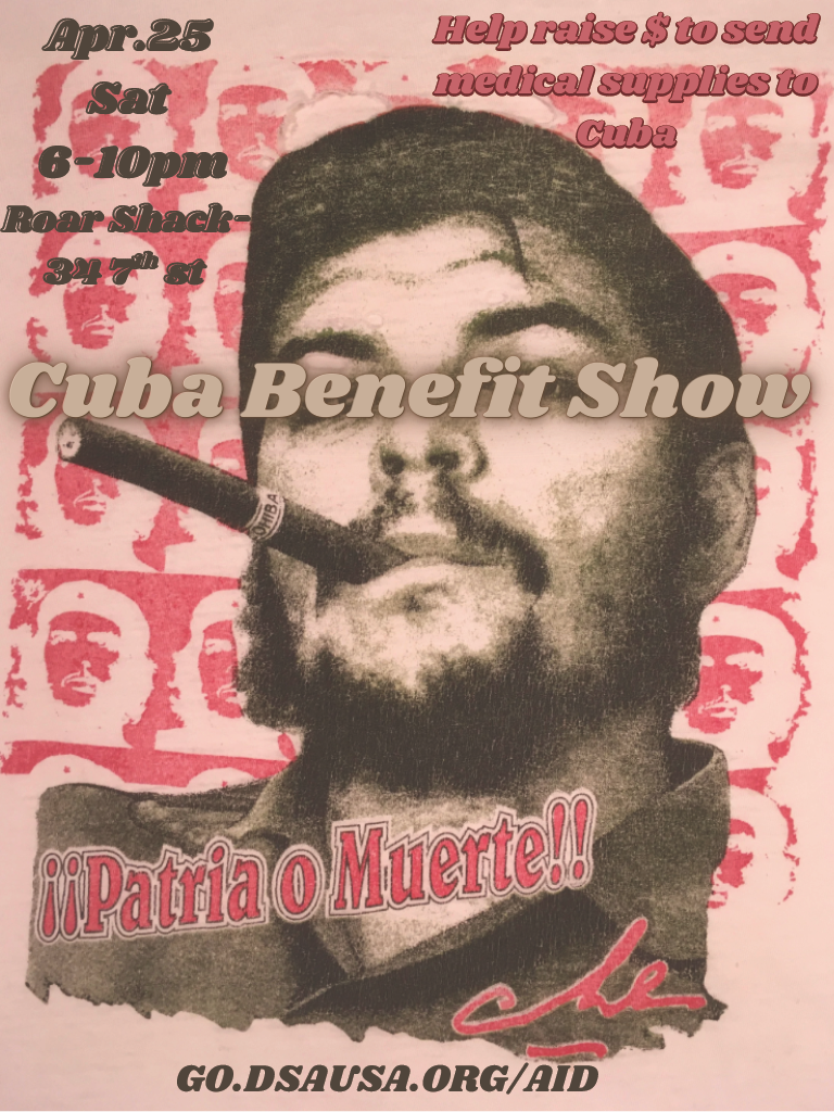 Come enjoy drinks and music Saturday night April 25th from 6 – 10 PM at The Roar Shack (34 7th St) to raise money for the people of Cuba. Fundraiser proceeds will be used to purchase medical and humanitarian supplies to send to the island in the face of the brutal US blockade and sanctions. RSVP here!