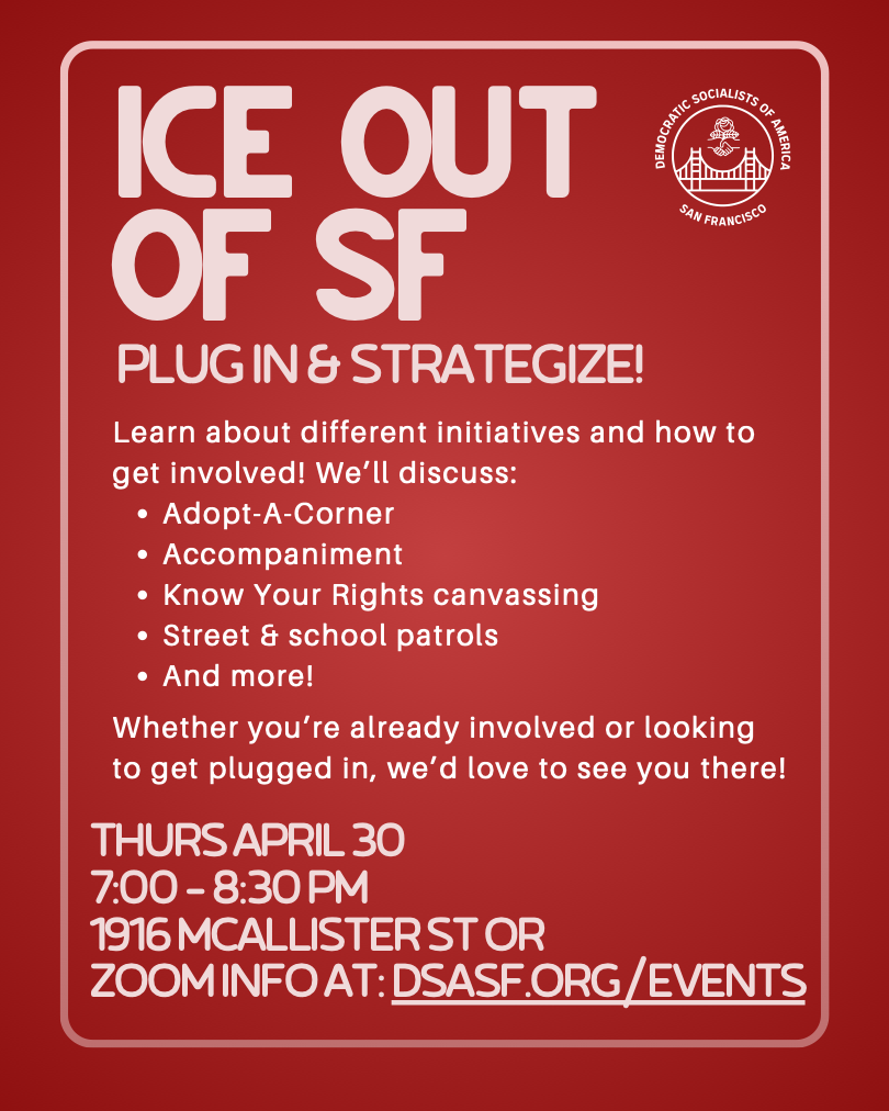 Come to the DSA SF Office at 1916 McAllister St or RSVP on zoom to join DSA SF’s Immigrant Justice Working Group on Thursday April 30 at 7 PM and learn about how your neighbors are getting involved in initiatives to defend our immigrant communities here in San Francisco.
