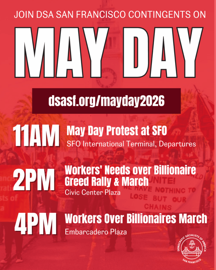 There will be three events on May 1. Please choose whichever one works best for you. Get ready to show up, wear red, and stand in solidarity with the international working-class and demonstrate our collective strength here in San Francisco. If you are a DSA SF member, go to our Slack and look for Signal groups for each event (in one-big-slack channel). Also, find our contingents at each event by looking for our red DSA SF flags. 🚩