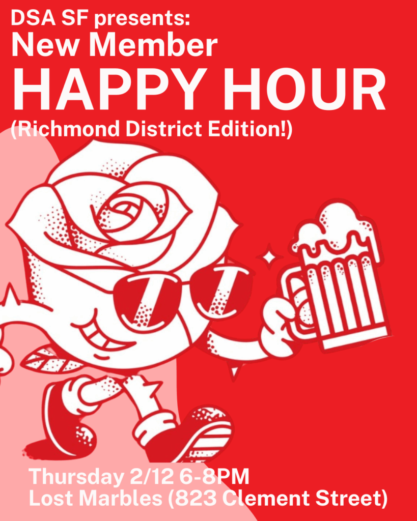 Join us for our a Happy Hour on Thursday, February 12th, 6:00 PM – 8:00 PM, at Lost Marbles Brewery, 823 Clement St. Learn more about DSA SF’s upcoming projects, find out how to plug in, or just socialize with socialists!