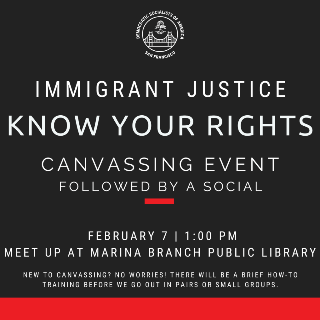 Join the Immigrant Justice working group Saturday, February 7 at 1:00 PM for a KYR canvass in the Marina district, followed by a happy hour where we’ll be grabbing food and drinks and doing a debrief on canvassing! Meet up at the Marina Branch Public Library!