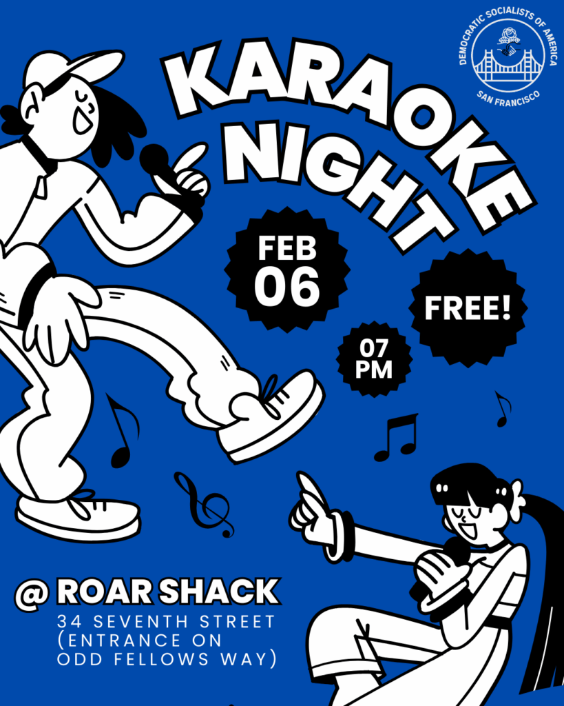 This Friday, February 6, 7:00 – 11:00 PM, come hang out at the Roar Shack (34 7th Street) and do some FREE karaoke with your fellow DSA SF comrades or cool people you want to impress with your incredible singing voice! No songs refused, no entry denied! The entrance is on Odd Fellows Way around the corner from 7th Street.