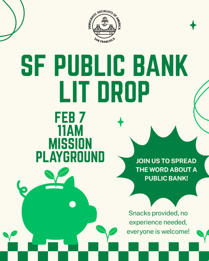 Please join the Ecosocialist Working Group and the SF Public Bank Coalition for a lit drop event this upcoming Saturday, February 7th at 11:00 AM. We’ll be meeting at Mission Playground (Valencia between 19th and 20th). No experience needed and snacks will be provided. RSVP here.