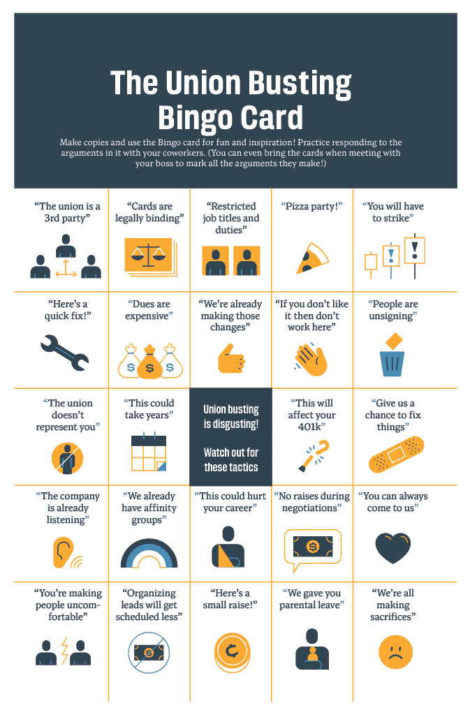 We heard from Diego, a Trader Joe’s worker whose union election ended in a tie, during “Inoculation and the Boss Campaign”. The boss targeted workers that were less informed about their rights or shakier in their commitment to organizing in order to catch people off guard. It was important that organizers had people prepared to combat the anti-union narrative in larger captive meetings and after 1:1s with management. We went through the union busting bingo card to ideate what we could say in response to anti-organizing rhetoric, whether it was from management or fellow coworkers.