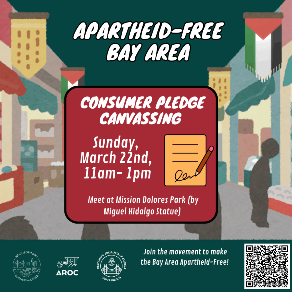 🌹 Sunday March 22 (11:00 AM – 1:00 PM): 🐣 No Appetite for Apartheid Consumer Pledge Canvass (Mission Dolores Park by Miguel Hidalgo Statue)