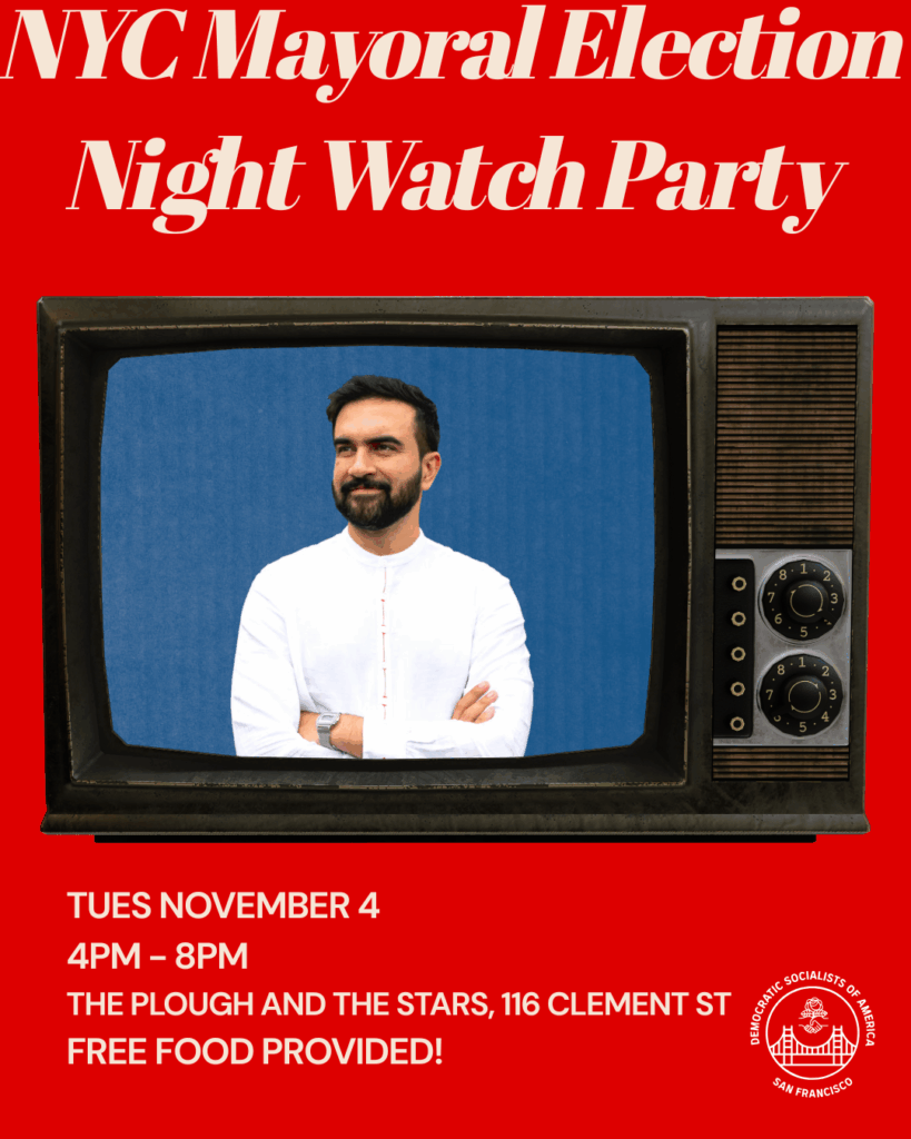 Join us on tonight, November 4 to watch LIVE election night results for the NYC Mayoral race! DSA SF members are proud of NYC DSA member Zohran Mamdani and the tens of thousands of volunteers and comrades that have built the historic movement backing him. We will be cheering Zohran on from across the country as we watch for results. Solidarity!