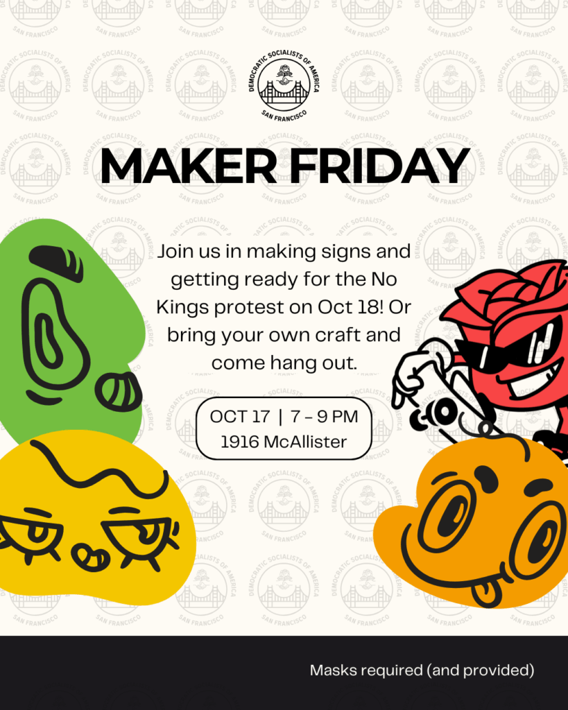 On Friday, October 17 from 7:00 – 9:00PM we’ll be preparing for the No Kings protest! Join us at 1916 McAllister to make signs and flyers. 🐣 Everyone is welcome!