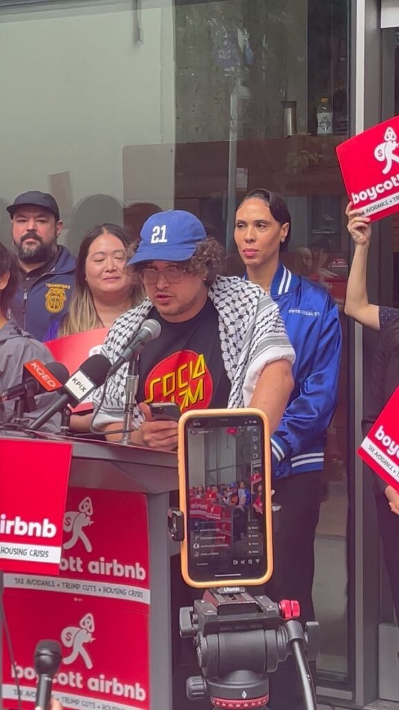 This past Wednesday, October 8th kicked off the campaign with a press conference outside of Airbnb’s headquarters at 888 Brannan. Comrade Firas (of IFPTE Local 21) gave a strong speech condemning Airbnb’s corporate greed, displacement of workers, and reliance on the very same public services and beautiful city that they’re refusing to pay taxes for. Capitalism enables and encourages billionaires and corporations to avoid paying their fair share, and we will not let them get away with it!