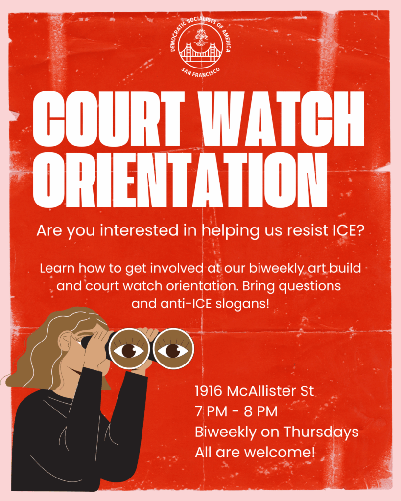 Come one, come all to 1916 McAllister St for our court watch orientation! You’ll learn how we are resisting ICE , how you can help, and participate in a biweekly art build. Bring questions and anti-ICE slogans! This event will take place every other week on Thursdays starting at 7:00 PM and the next one is October 9th!