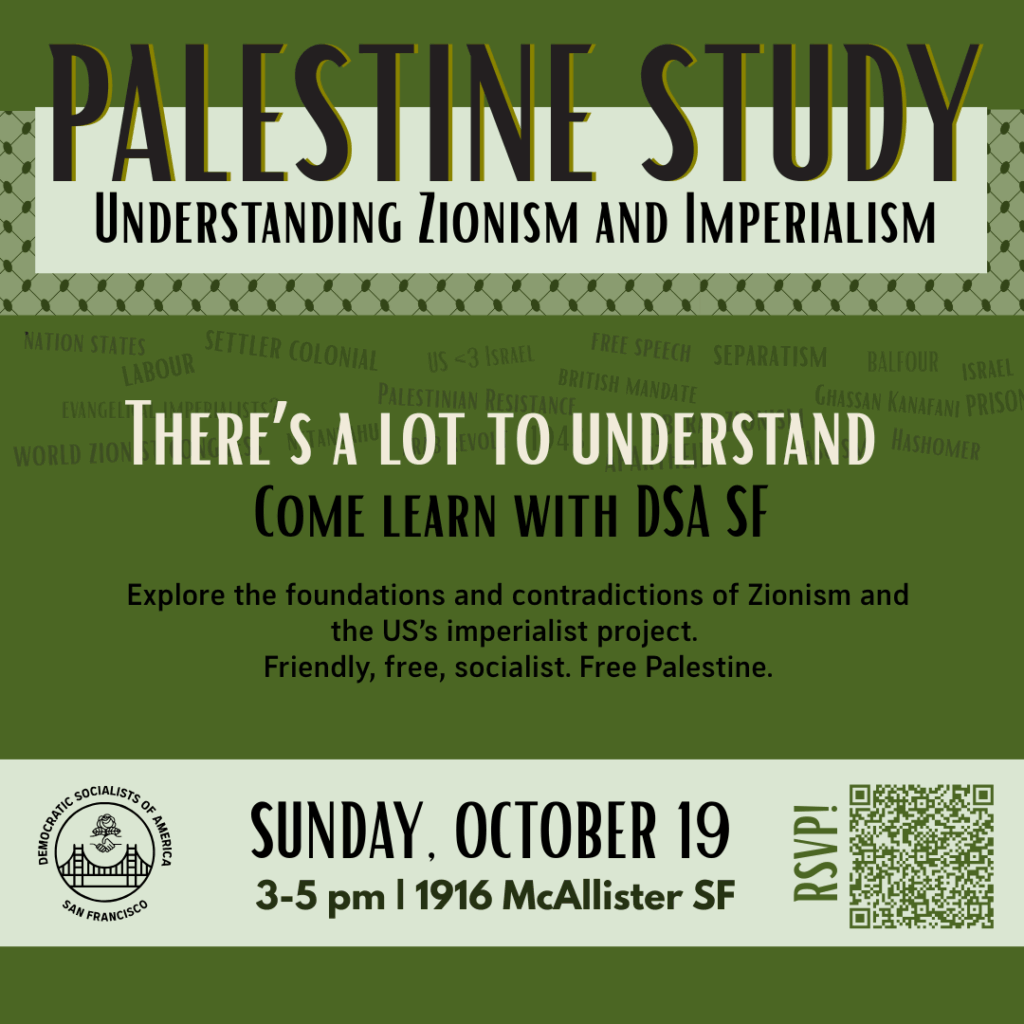 Join DSA SF on Sunday, October 19 from 3:00 PM to 5:00 PM at 1916 McAllister St for the upcoming Palestine Study exploring the foundations of Zionism and how we fight imperialism for Palestinian liberation. We will equip ourselves with a precise understanding of the history, foundations, aspirations, and contradictions of Zionism in order to fight for Palestinian liberation. Participants will walk away from this first session with a precise understanding of the forces that propelled the colonization of Palestine and how US imperialist interests continue the efforts today. This curriculum is designed especially for those new to DSA, the Palestine movement, or those deepening their commitment to being anti-zionist. RSVP here!